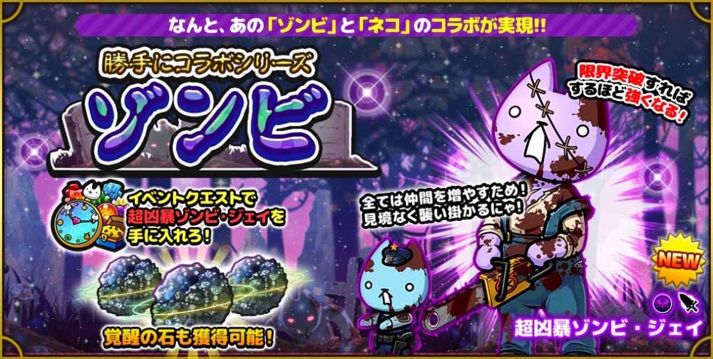 コラボイベント開催中!本日から4/6 12:59まで☆なんとあの「ゾンビ」と「ぼくとネコ」とのコラボが実現!進化させると激レアキャラにレアリティアップ!